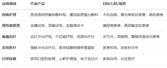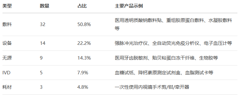 敷料類產(chǎn)品占據(jù)半壁江山,主要集中在創(chuàng)面護理(如透明質酸鈉、膠原蛋白類),反映市場對術后護理、皮膚修復需求旺盛。