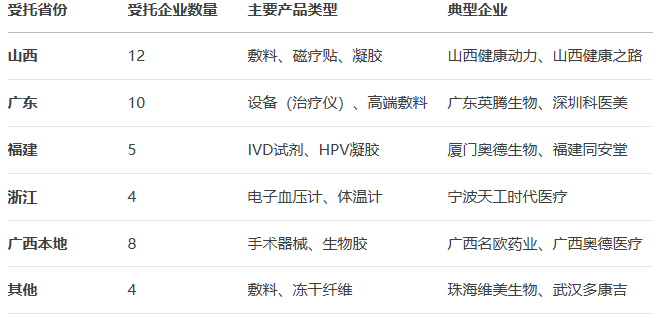成本驅動型委托:低技術產(chǎn)品(如敷料、磁療貼)集中委托至山西(人力與生產(chǎn)成本低)。