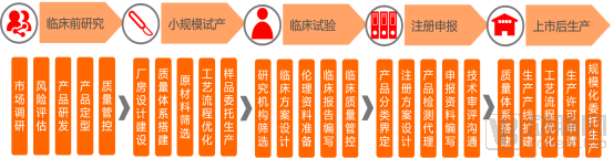 醫(yī)療器械研發(fā)外包服務(wù)涵蓋臨床前研究、小規(guī)模試產(chǎn)、臨床試驗(yàn)、注冊申報(bào)和上市后生產(chǎn)5個(gè)環(huán)節(jié)。根據(jù)不同環(huán)節(jié)提供針對性的服務(wù),主要包括市場調(diào)研、風(fēng)險(xiǎn)管理、產(chǎn)品定型、廠房設(shè)計(jì)建設(shè)、工藝流程優(yōu)化、臨床試驗(yàn)方案設(shè)計(jì)、申報(bào)資料編寫、規(guī)?;猩a(chǎn)等。醫(yī)療器械研發(fā)外包服務(wù)企業(yè)包括醫(yī)療器械CRO與醫(yī)療器械CDMO兩類。