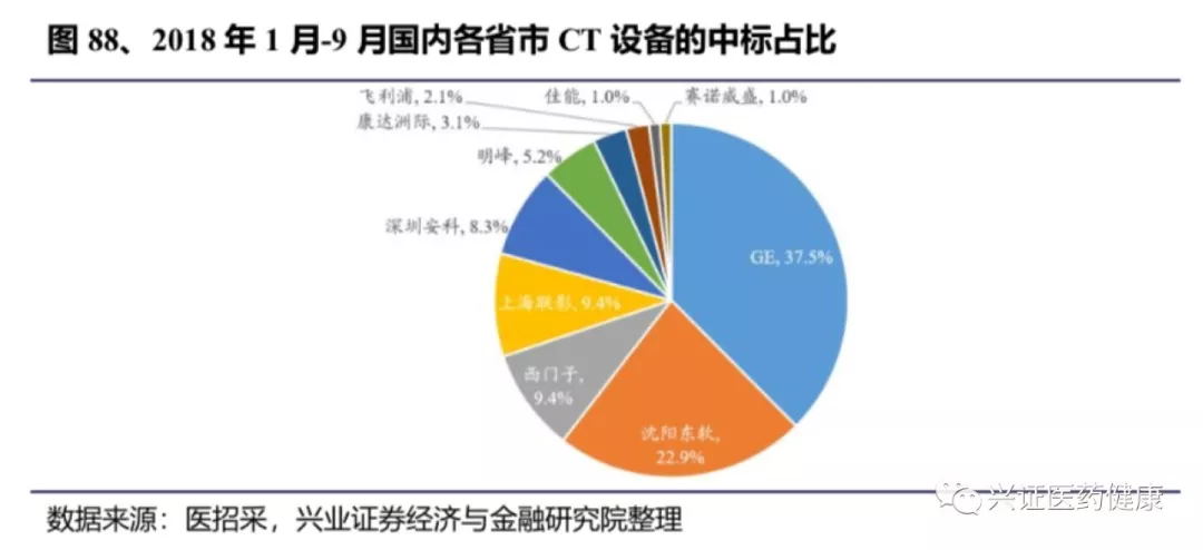 CT是根據(jù)人體不同組織對(duì)X線的吸收與透過率的不同,應(yīng)用靈敏度極高的儀器對(duì)人體進(jìn)行測(cè)量,然后將測(cè)量所獲取的數(shù)據(jù)輸入計(jì)算機(jī),再對(duì)數(shù)據(jù)進(jìn)行處理后,就可攝下人體被檢查部位的斷面或立體的圖像,發(fā)現(xiàn)體內(nèi)任何部位的細(xì)小病變。根據(jù)中國(guó)醫(yī)學(xué)裝備協(xié)會(huì)發(fā)布的《2016年中國(guó)CT設(shè)備市場(chǎng)研究報(bào)告》,截止到2016年底,CT設(shè)備全國(guó)市場(chǎng)保有量突破20000臺(tái),相比2015年的19592臺(tái),保有量增長(zhǎng)10%;2012-2016年CT保有量復(fù)合增長(zhǎng)率為10.2%。2012年-2016年,我國(guó)CT設(shè)備市場(chǎng)每年新增銷量從2074臺(tái)增長(zhǎng)到了2575臺(tái),年復(fù)合增長(zhǎng)率為5%。我國(guó)在用的12074臺(tái)CT設(shè)備中,GPS呈現(xiàn)三足鼎立的競(jìng)爭(zhēng)格局,其中GE占34%,西門子占28%,飛利浦占14%,合計(jì)市占率達(dá)到86%。由于近年來國(guó)家政策的鼓勵(lì),東軟、聯(lián)影、安科等國(guó)產(chǎn)企業(yè)也開始發(fā)力,進(jìn)口設(shè)備的比例將持續(xù)降低。值得一提的是,在二級(jí)醫(yī)院市場(chǎng)中,國(guó)產(chǎn)品牌代表之一的東軟醫(yī)療打破國(guó)外壟斷,以超過10%的占有率躋身一線品牌行列。根據(jù)2018年1月-9月的全國(guó)各省市CT中標(biāo)結(jié)果來看,GE、東軟的中標(biāo)數(shù)最高,分別為36和22臺(tái);其次為西門子、聯(lián)影、安科,佳能、賽諾威盛中標(biāo)數(shù)量相對(duì)較少,已經(jīng)可以看到國(guó)產(chǎn)CT實(shí)現(xiàn)進(jìn)口替代的曙光。根據(jù)《2016年中國(guó)CT設(shè)備市場(chǎng)研究報(bào)告》,2015年,單雙層低端CT市場(chǎng)保有量占CT市場(chǎng)總額的51%,三級(jí)醫(yī)院主力機(jī)型64排及以上高端CT市場(chǎng)保有量占比接近20%。2015年16排CT銷量份額48%,單雙層CT銷量份額為15%,份額持續(xù)下滑,64排及以上高端CT銷量份額36%。近幾年,64排CT逐步代替16排CT成為縣級(jí)醫(yī)院的主力機(jī)型,而16排CT主要在鄉(xiāng)鎮(zhèn)衛(wèi)生院裝機(jī)較多。CT作為鄉(xiāng)鎮(zhèn)衛(wèi)生院服務(wù)能力標(biāo)準(zhǔn)(2018年版)A類鄉(xiāng)鎮(zhèn)衛(wèi)生院必配設(shè)備,基層醫(yī)療機(jī)構(gòu)更傾向于采購(gòu)國(guó)產(chǎn)設(shè)備,一方面可以降低患者檢查成本,另一方面可以降低售后服務(wù)成本,這為國(guó)產(chǎn)品牌如東軟、聯(lián)影、安科、萬東等的進(jìn)口替代提供機(jī)會(huì)。國(guó)家衛(wèi)健委《大型醫(yī)用設(shè)備配置許可管理目錄(2018年)》提到部分設(shè)備如DSA、16排及以下CT、永磁磁共振無需再經(jīng)審批即可配置,對(duì)醫(yī)療機(jī)構(gòu)增加配置大型設(shè)備將起到正向激勵(lì)作用。衛(wèi)計(jì)委《關(guān)于發(fā)布2018—2020年大型醫(yī)用設(shè)備配置規(guī)劃的通知》中提到64排及以上CT未來三年內(nèi)國(guó)內(nèi)新增總臺(tái)數(shù)為3535臺(tái),也利好國(guó)內(nèi)生產(chǎn)該類設(shè)備的企業(yè)。此外,根據(jù)《2016年中國(guó)CT設(shè)備市場(chǎng)研究報(bào)告》,截止到2016年初,59%的CT設(shè)備購(gòu)置在2010-2015年期間,28%的CT設(shè)備購(gòu)置在2005-2010年期間,13%的CT設(shè)備購(gòu)置在2005年以前,使用已超過10年,超期服役的設(shè)備大約有1500多臺(tái),這也是下一批更新?lián)Q代的主要對(duì)象,國(guó)產(chǎn)廠商有望搶奪部分市場(chǎng)份額。目前,我國(guó)國(guó)產(chǎn)CT的技術(shù)難點(diǎn)主要在于探測(cè)單元的制造工藝,要求探測(cè)單元陣列數(shù)多(即排數(shù)多)、旋轉(zhuǎn)及感應(yīng)速度快,對(duì)拼接工藝又有極高的標(biāo)準(zhǔn),需要單元與單元間隙盡可能小。在東軟醫(yī)療的帶領(lǐng)下,我國(guó)CT研發(fā)不斷實(shí)現(xiàn)技術(shù)突破,從東軟2012年推出首臺(tái)中國(guó)研制64排螺旋CT到2015年的128排螺旋CT,聯(lián)影、安科、萬東等企業(yè)也緊跟其腳步。目前,我國(guó)CT行業(yè)第一梯隊(duì)主要致力于64排CT的研發(fā)和注冊(cè),隨著滿足高性能檢測(cè)的64排CT的陸續(xù)上市,預(yù)計(jì)我國(guó)CT格局將發(fā)生改變。