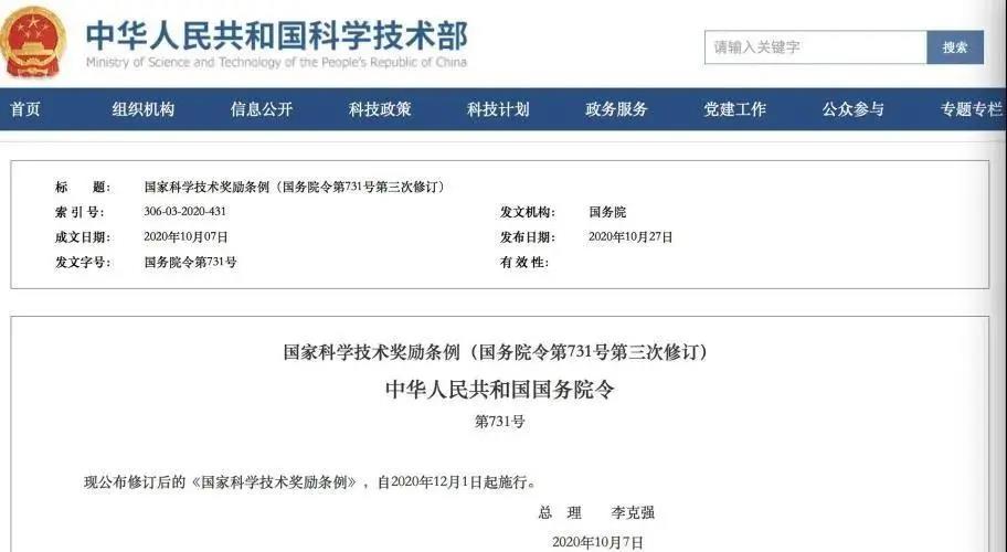 國務(wù)院總理李克強日前簽署國務(wù)院令,公布修訂后的《國家科學(xué)技術(shù)獎勵條例》(以下簡稱《條例》),自2020年12月1日起施行。