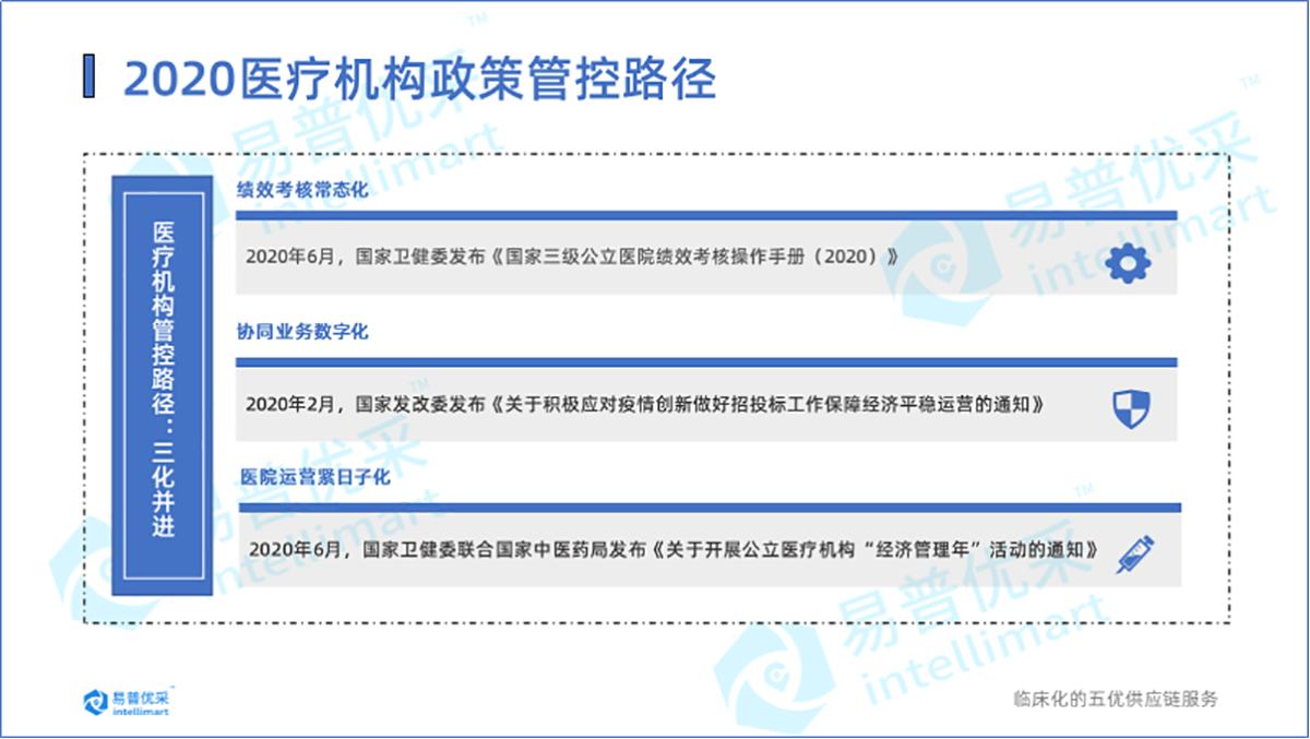 總體來看,國(guó)家對(duì)公立醫(yī)療機(jī)構(gòu)的管控主要集中在三個(gè)層面。其一是績(jī)效考核的常態(tài)化,其二是受新冠疫情的影響,公立醫(yī)院對(duì)于線上交互的需求激增,協(xié)同業(yè)務(wù)甚至更多的管理方式將逐步向數(shù)字化轉(zhuǎn)變。其三是隨著成本壓力的陡增,國(guó)家已明確要求公立醫(yī)療機(jī)構(gòu)應(yīng)牢固樹立“過緊日子”的理念,花好每一分錢。