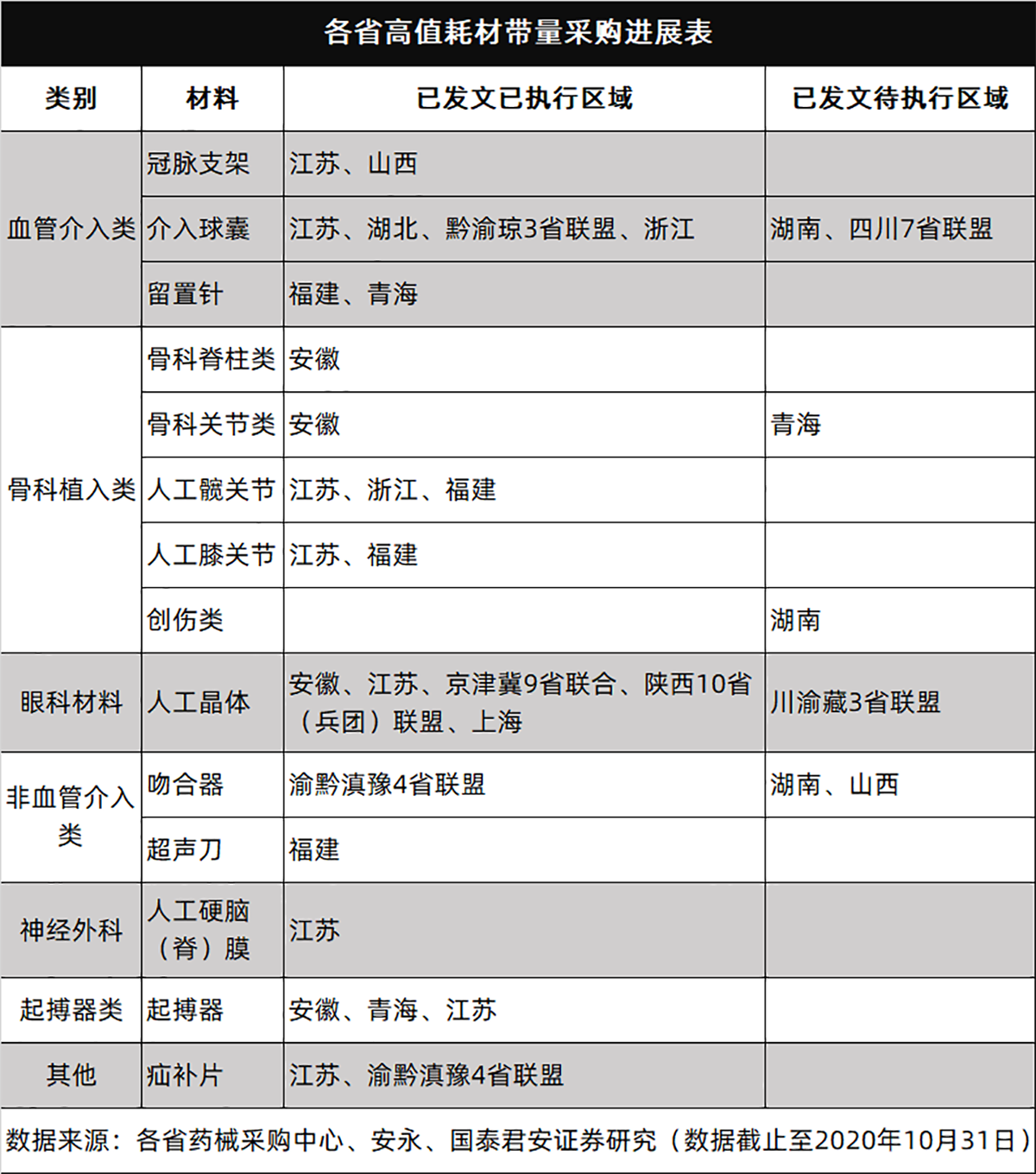 與藥品不同,高值耗材帶量采購(gòu)地方的探索并不遜于國(guó)家層面。根據(jù)國(guó)泰君安證券研究統(tǒng)計(jì),2020年11月5日,國(guó)家冠脈支架帶量采購(gòu)?fù)瓿桑?0款入圍產(chǎn)品平均終端價(jià)格降幅超過90%。地方帶量采購(gòu)截至2020年11月20日,已完成或正在進(jìn)行的省級(jí)聯(lián)盟采購(gòu)6項(xiàng),省及直轄市獨(dú)立采購(gòu)11項(xiàng),地市級(jí)(含聯(lián)盟)采購(gòu)30余項(xiàng),集中在心血管介入、骨科、眼科三大領(lǐng)域,平均終端價(jià)格降幅約60%。中國(guó)高值耗材行業(yè)正式進(jìn)入帶量采購(gòu)時(shí)代。