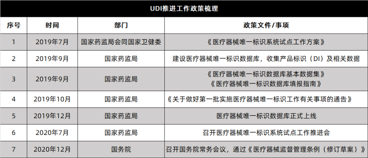 2020年7月,國(guó)家藥監(jiān)局召開醫(yī)療器械唯一標(biāo)識(shí)系統(tǒng)試點(diǎn)工作推進(jìn)會(huì),進(jìn)一步推進(jìn)各試點(diǎn)單位UDI探索工作。12月,國(guó)務(wù)院常務(wù)會(huì)議召開,通過《醫(yī)療器械監(jiān)督管理?xiàng)l例(修訂草案)》,并重點(diǎn)強(qiáng)調(diào)要充實(shí)監(jiān)管手段,增設(shè)產(chǎn)品唯一標(biāo)識(shí)追溯、延伸檢查等監(jiān)督措施。