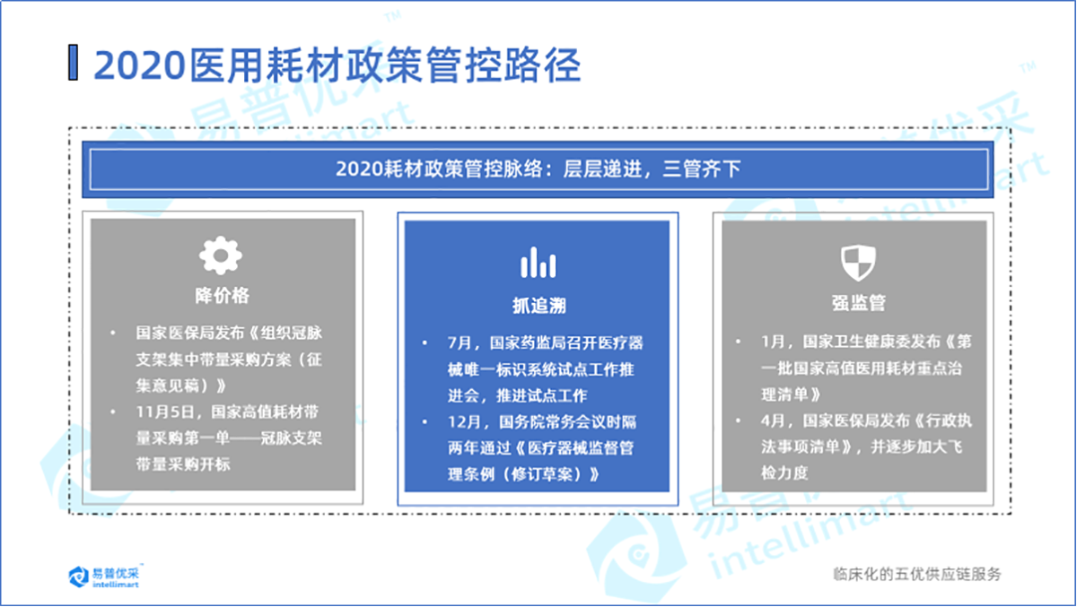 聚焦到2020年,醫(yī)用耗材的政策管控可概括為3條主線。第一條劍指“降價(jià)”:以帶量采購(gòu)為核心,國(guó)家和地方齊頭并進(jìn),中國(guó)高值耗材行業(yè)正式進(jìn)入帶量采購(gòu)時(shí)代;第二條緊抓“追溯”:持續(xù)推進(jìn)UDI試點(diǎn)工作,探索從源頭生產(chǎn)到最終臨床使用的全生命周期管理體系;