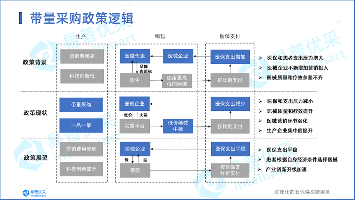 高值耗材帶量采購(gòu)的政策邏輯與藥品相似,均是通過以量換價(jià),降低虛高價(jià)格,節(jié)省醫(yī)保資金。對(duì)于產(chǎn)業(yè)而言,械企憑借研發(fā)/生產(chǎn)/質(zhì)量控制/管理等綜合優(yōu)勢(shì),在質(zhì)量能夠保證的前提下通過低價(jià)中標(biāo),由支付方——醫(yī)保保障量的落實(shí),減少渠道、終端推廣費(fèi)用,可將械企從無序的流通環(huán)節(jié)中解放出來,加強(qiáng)創(chuàng)新研發(fā),避免同質(zhì)競(jìng)爭(zhēng),引導(dǎo)產(chǎn)業(yè)創(chuàng)新升級(jí)。